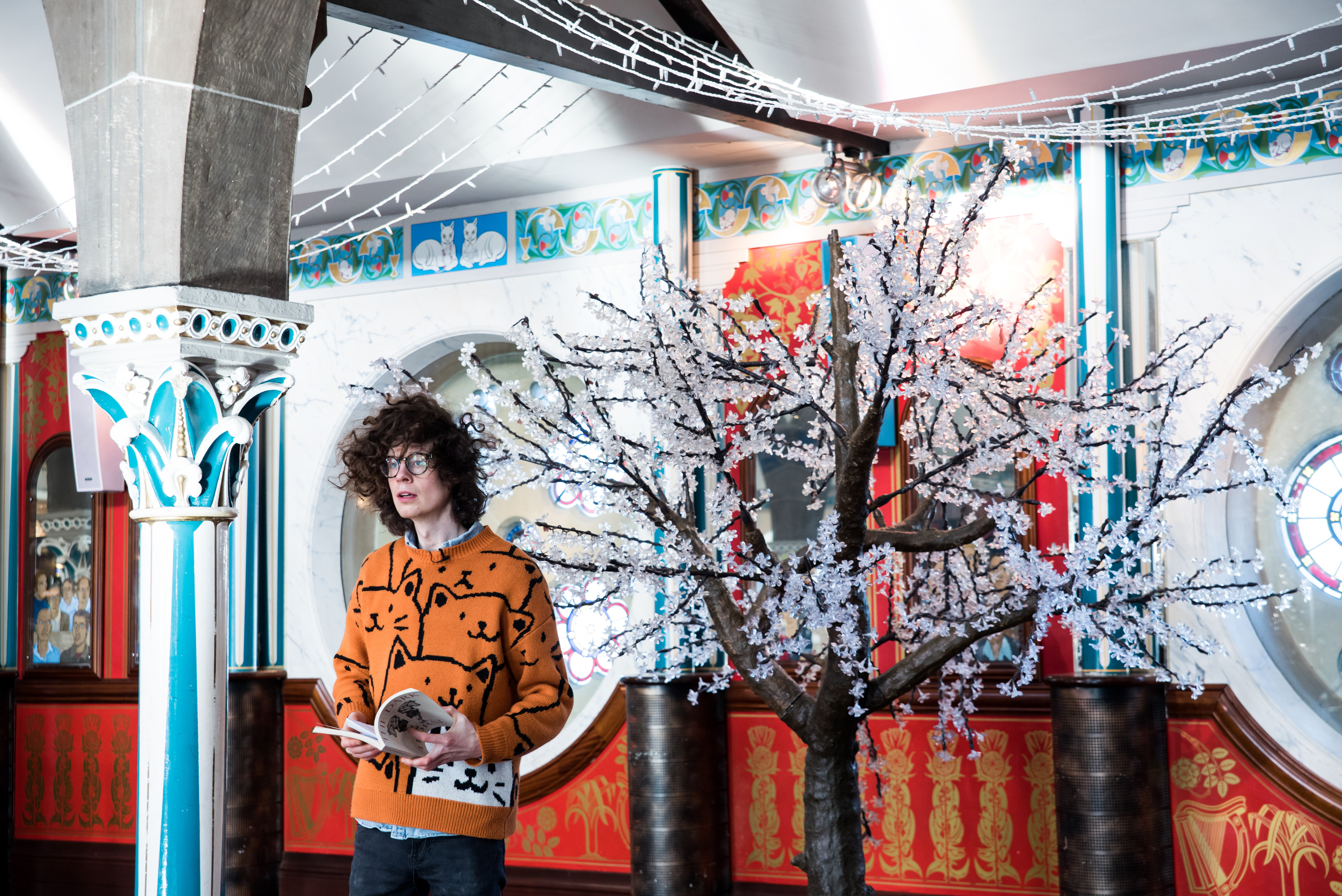 Denise Mina holding a copy of Lanark below the Alasdair Gray mural in the Òran Mór, during filming for the first Gray Day. Photo by Kat Gollock. -